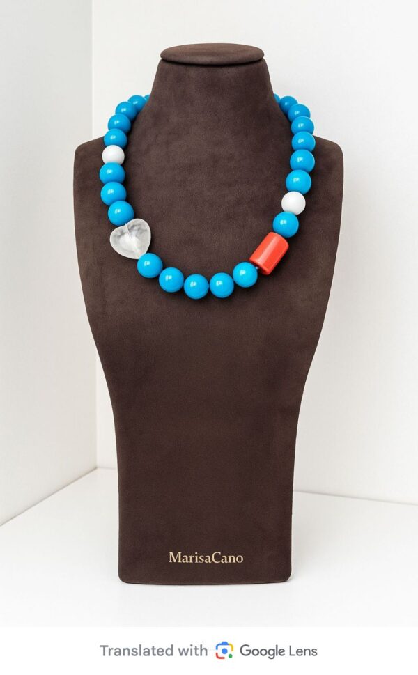 Bonito collar, elaborado en turquesa (azul) cuarzo rosa (corazón) ágata blanca y coral.